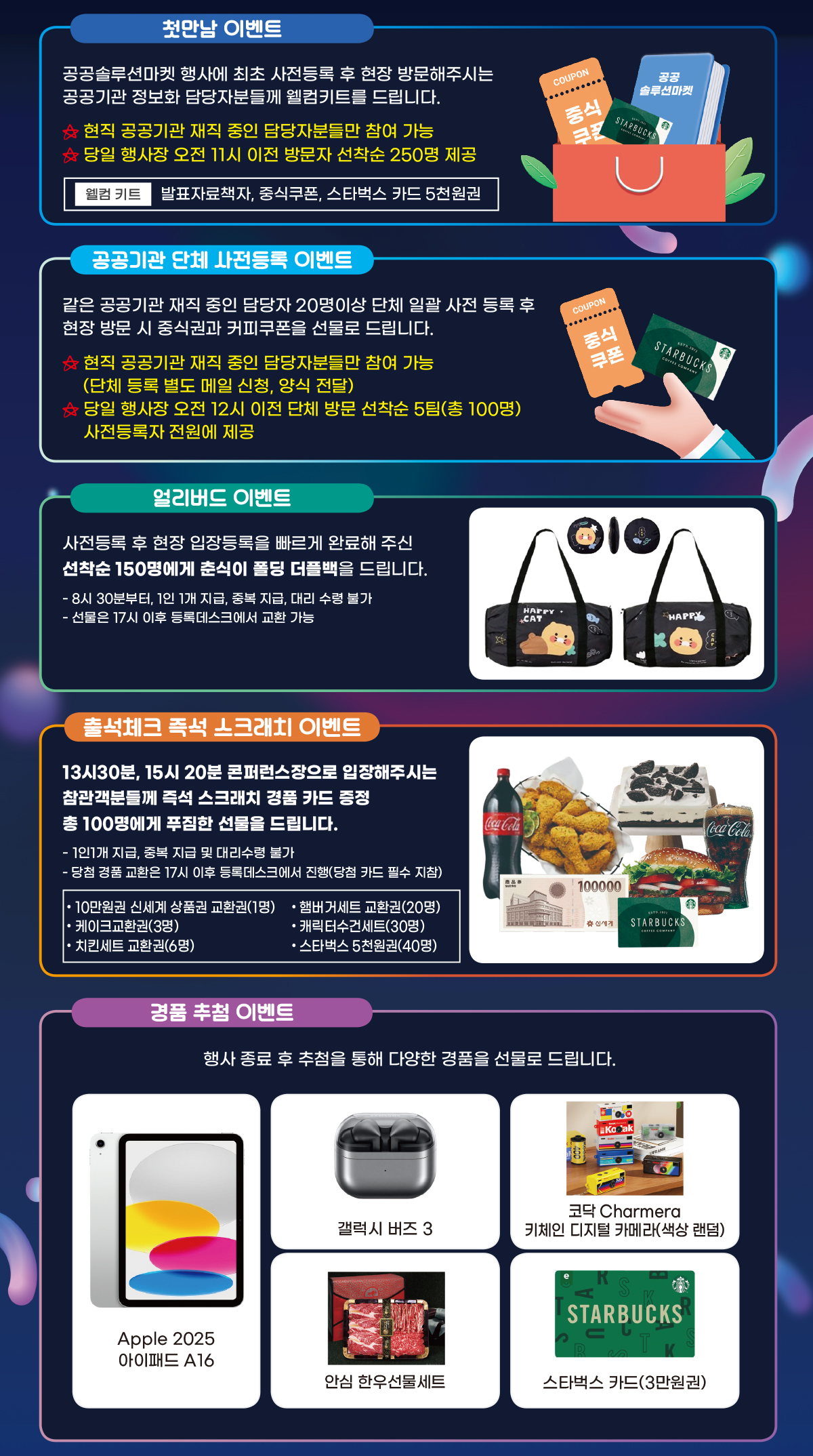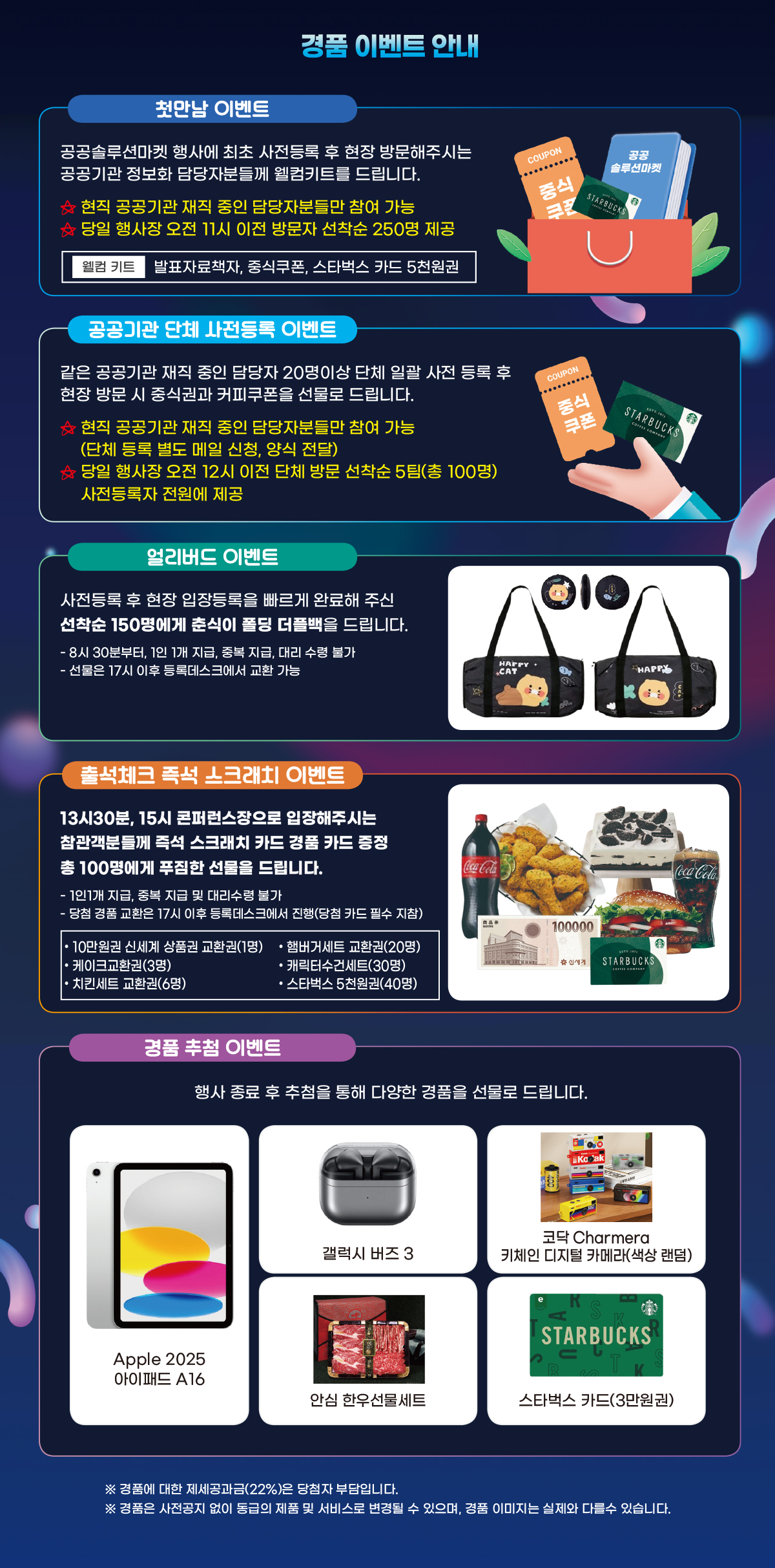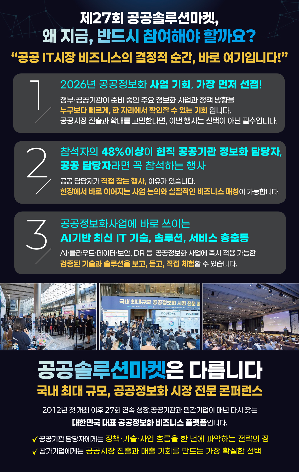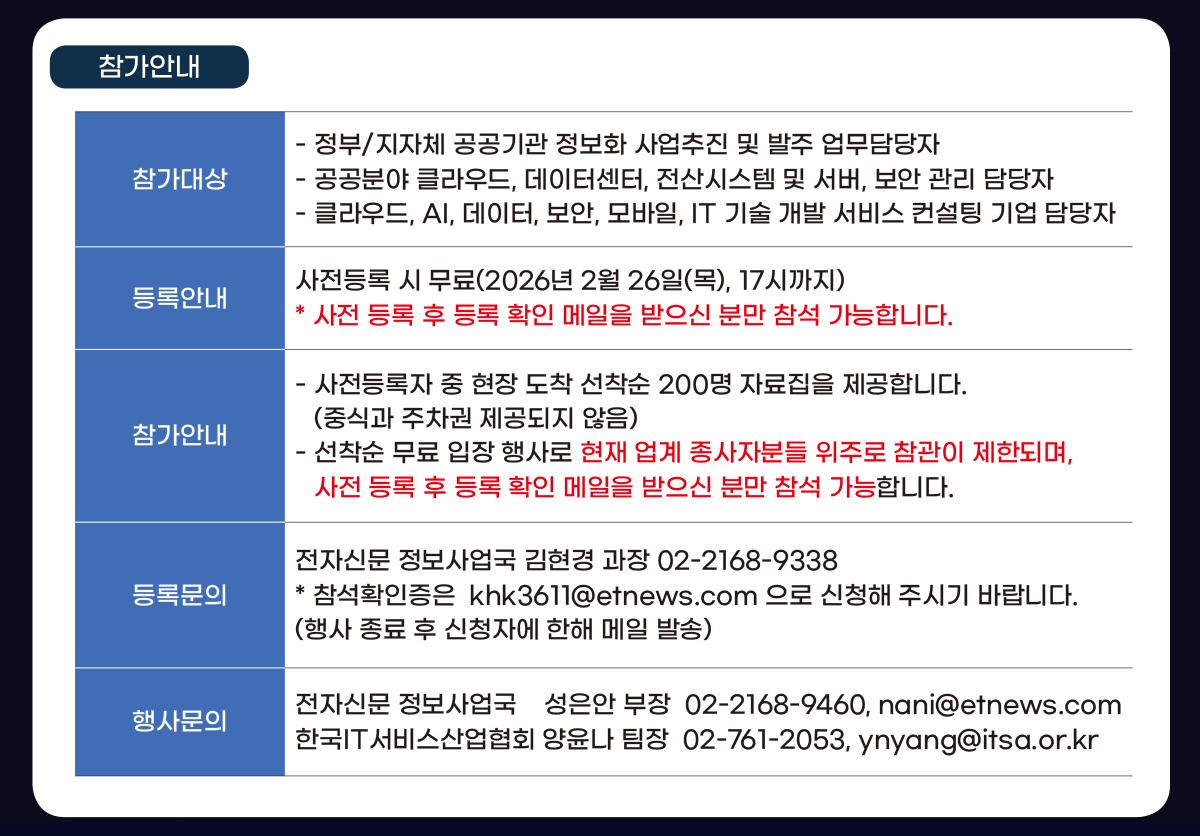| 17:10~17:30(20’) | 2026년도 공공기관 정보화 사업계획 경기도경제과학진흥원 김다연 대리 | 2026년 국토안전관리원 정보화사업 소개 국토안전관리원 박준용 실장 | 2026년도 공공기관 정보화 사업계획 국가보훈부 전태욱 사무관 |